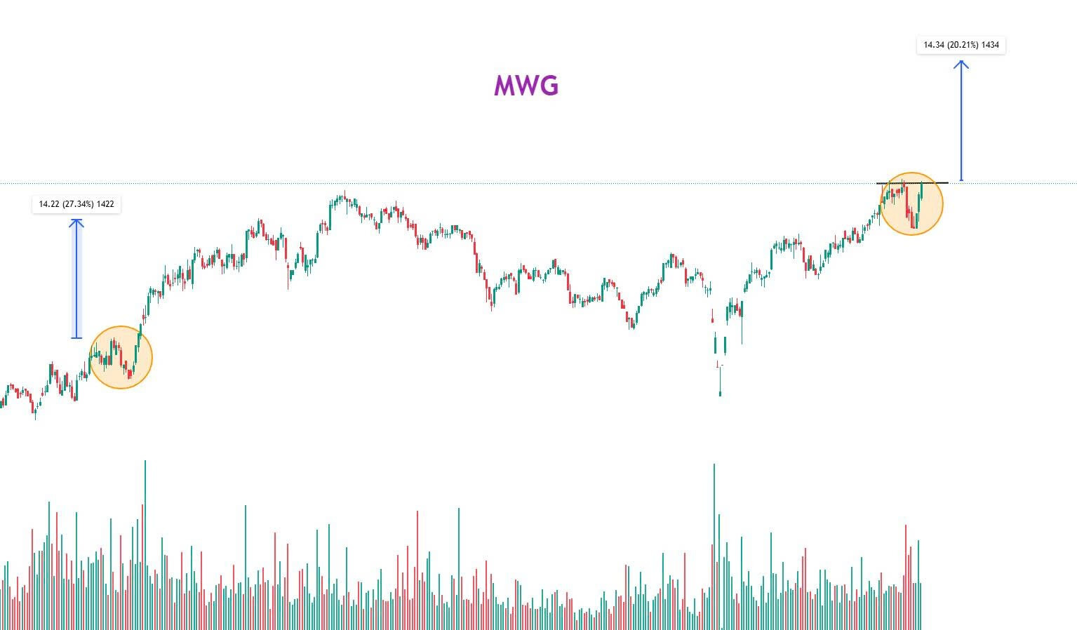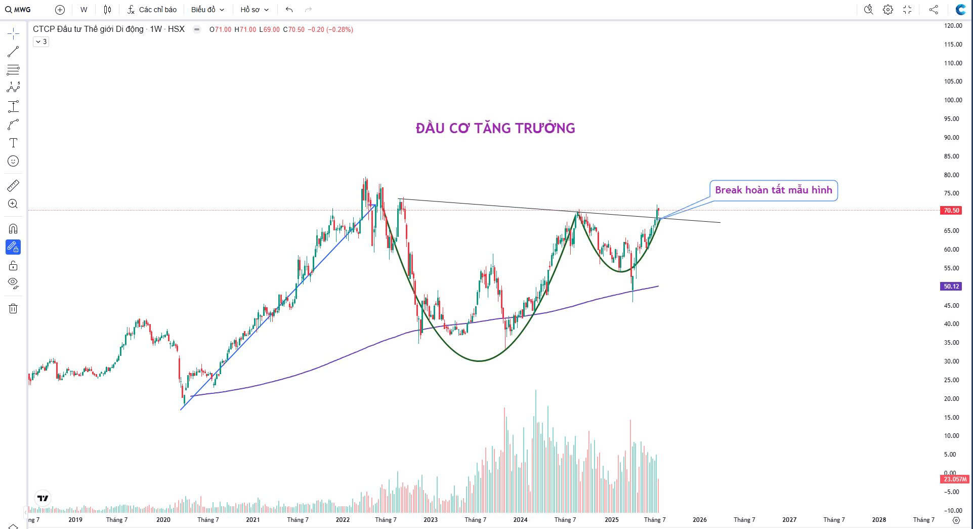 MWG vận động trong mẫu hình tiếp diễn xu hướng tăng chờ break kênh để bước vào đà tăng