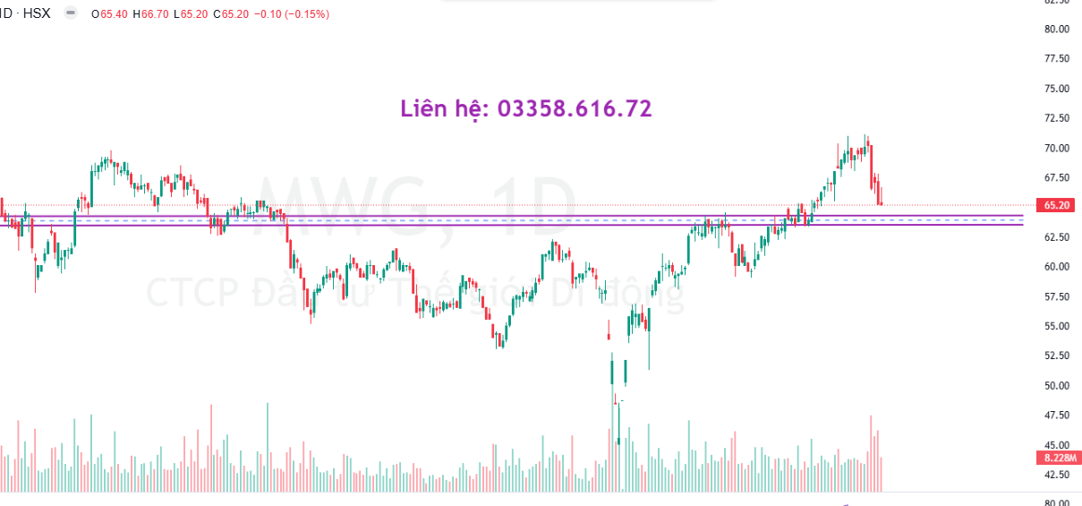 Giai đoạn thị trường biến động mạnh trong thời gian, MWG đã vận động về test kênh xu hướng tăng từ vùng đáy Covid cho đến thời điểm hiện tại. Dòng tiền nhập cuộc mạnh mẽ khi cổ phiếu giảm mạnh cho thấy sự rũ bỏ mạnh.