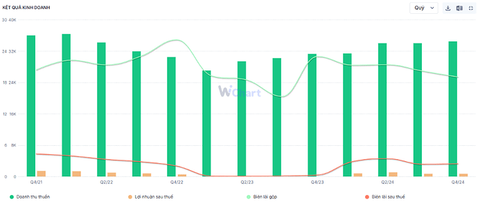 CTCP Thế giới di động đã công bố BCTC hợp nhất Q4/24 với doanh thu thuần đạt 34.574 tỷ đồng, tăng 10% so với cùng kỳ 2023. Sau khi trừ đi chi phí vốn bán hàng, lợi nhuận gộp ghi nhận 6.587 tỷ (+6,5% yoy), biên lãi gộp đạt 19% trong quý vừa qua.