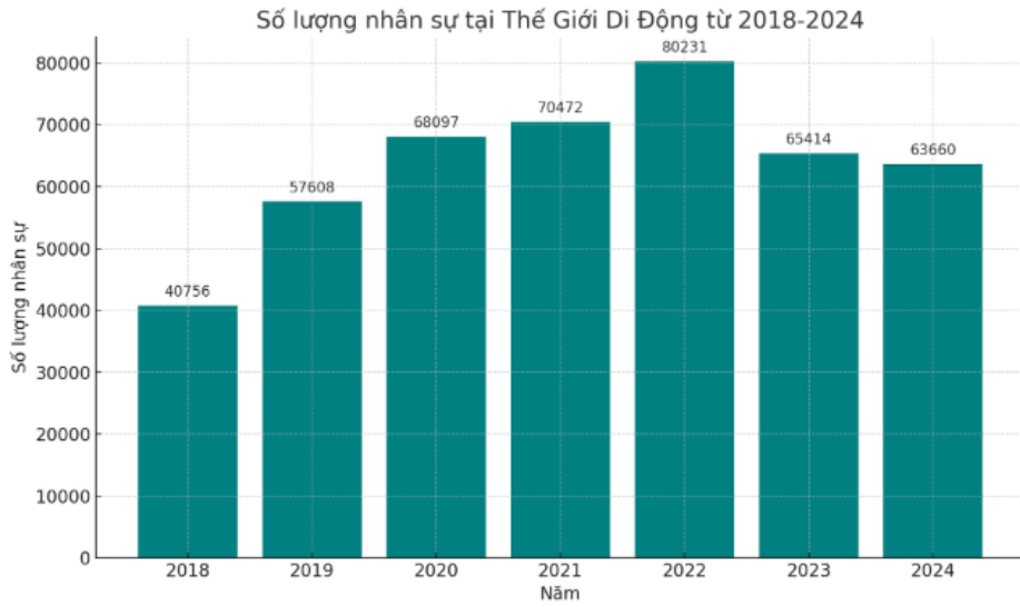 Ngoài ra, chi phí quản lý doanh nghiệp cũng tăng rất mạnh, lên mức 916 tỷ đồng. Theo chúng tôi, sau thời gian “giảm lượng, tăng chất”, tại Q4/24 MWG đã tuyển thêm người lao động, trong đó có cả nhân viên cũ, cùng với đó là nâng phúc lợi cho nhân viên. Tại thời điểm kết năm 2024, số lượng người lao động đạt 63.660 người – tăng khoảng 4.200 người so với mức thấp nhất trong 5 năm vừa qua. Lượng lao động mới này tập trung chủ yếu cho chuỗi siêu thị điện máy và Bách hóa xanh. (Hình 1)