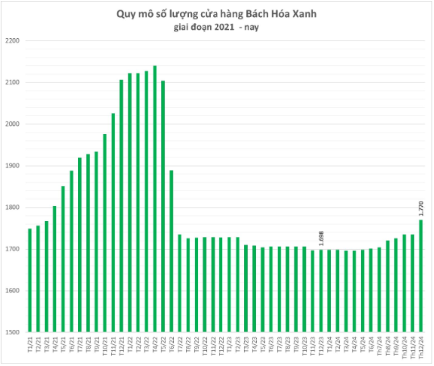 Nếu nhìn về quá khứ, không khó để thấy tốc độ mở cửa hàng trong năm 2024 bị chậm lại đáng kể. Kết năm 2024, BHX ghi nhận 1.770 cửa hàng – tăng 72 cửa hàng so với cuối 2023. Thế nhưng, nhìn lại 2024 có thể thấy đây là một năm mà ban lãnh đạo mạnh tay tái cấu trúc chuỗi, giảm các chi phí capex để tăng hiệu quả hoạt động của chuỗi, từ đó tìm ra công thức hòa vốn vào tháng 8. Đó là lí do việc mở mới cửa hàng không được quá chú trọng.