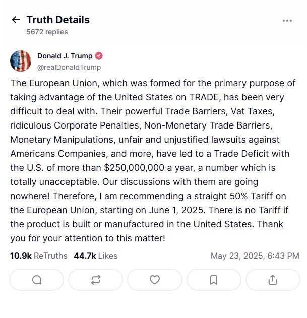 Trong Cuối Tuần Qua: Tổng thống Mỹ Donald Trump đã tiếp tục làm giới đầu tư lo ngại về việc tuyên bố ý định áp thuế 50% lên các mặt hàng Châu Âu: