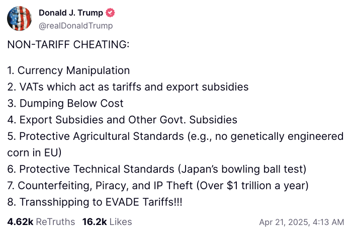 Tổng thống Hoa Kỳ Doanld Trump viết trên mạng xã hội Truth Social liệt kê danh sách các hành vi gian lận phi thuế quan.