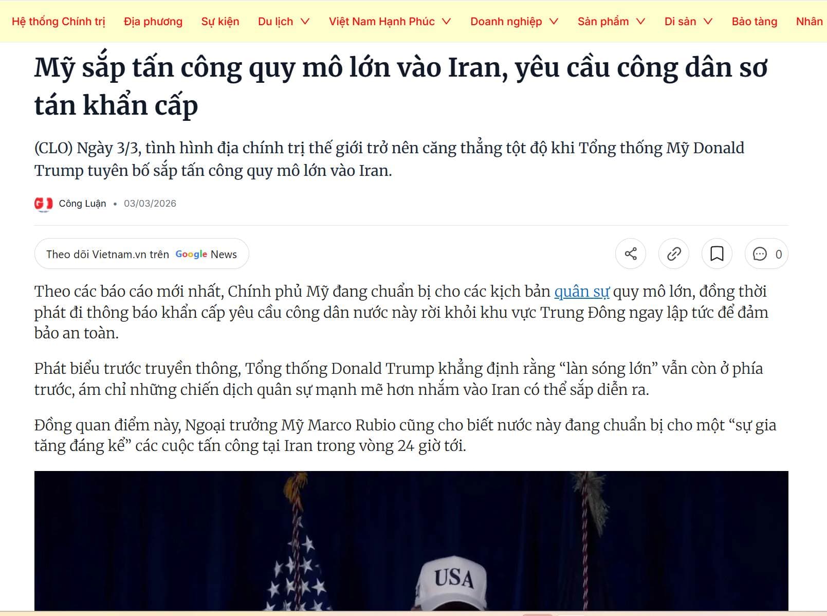 Theo các báo cáo mới nhất, Chính phủ Mỹ đang chuẩn bị cho các kịch bản quân sự quy mô lớn, đồng thời phát đi thông báo khẩn cấp yêu cầu công dân nước này rời khỏi khu vực Trung Đông ngay lập tức để đảm bảo an toàn.