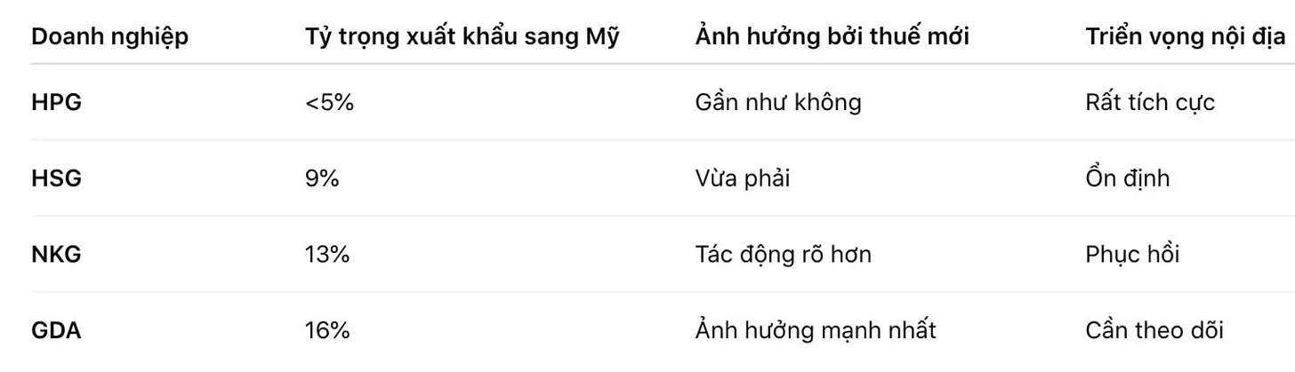- Việc thuế suất cao được áp dụng tại thị trường Mỹ đang tạo ra áp lực lớn lên các doanh nghiệp thép Việt Nam, buộc họ phải điều chỉnh chiến lược giá bán. Để giữ được thị phần, nhiều đơn vị sẽ phải giảm giá sản phẩm – điều này có thể ảnh hưởng trực tiếp đến biên lợi nhuận gộp . Theo phân tích từ MBS Research, NKG có thể phải giảm giá khoảng 4%, trong khi HSG và GDA dự kiến điều chỉnh giảm gần 3%. Riêng Hòa Phát (HPG) nhờ cơ cấu sản phẩm và thị trường ổn định nên gần như không chịu tác động đáng kể từ biến động lần này.