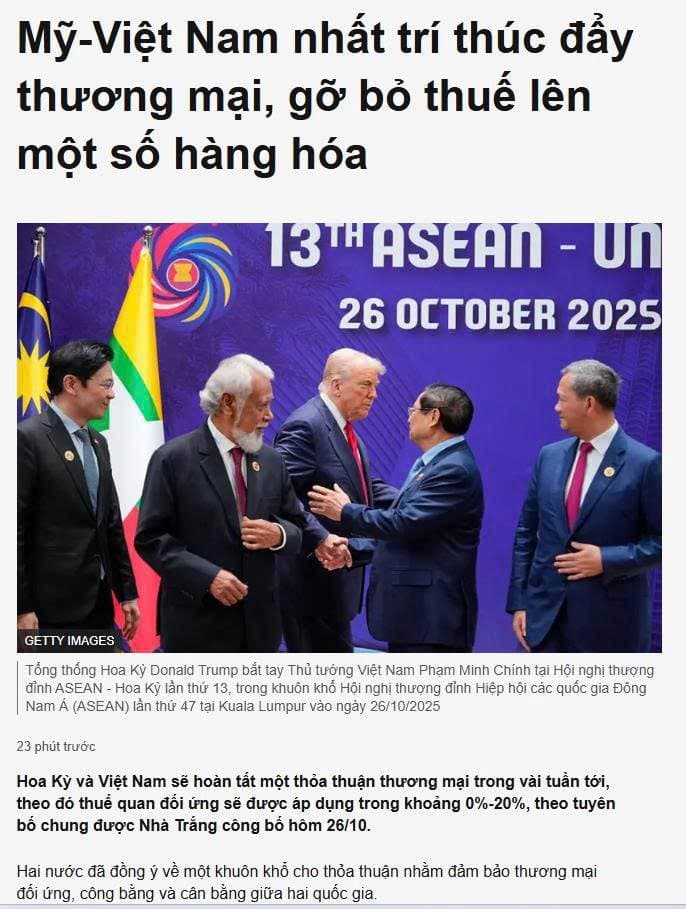 Hoa Kỳ và Việt Nam sẽ hoàn tất một thỏa thuận thương mại trong vài tuần tới, theo đó thuế quan đối ứng sẽ được áp dụng trong khoảng 0%-20%, theo tuyên bố chung được Nhà Trắng công bố hôm 26/10.