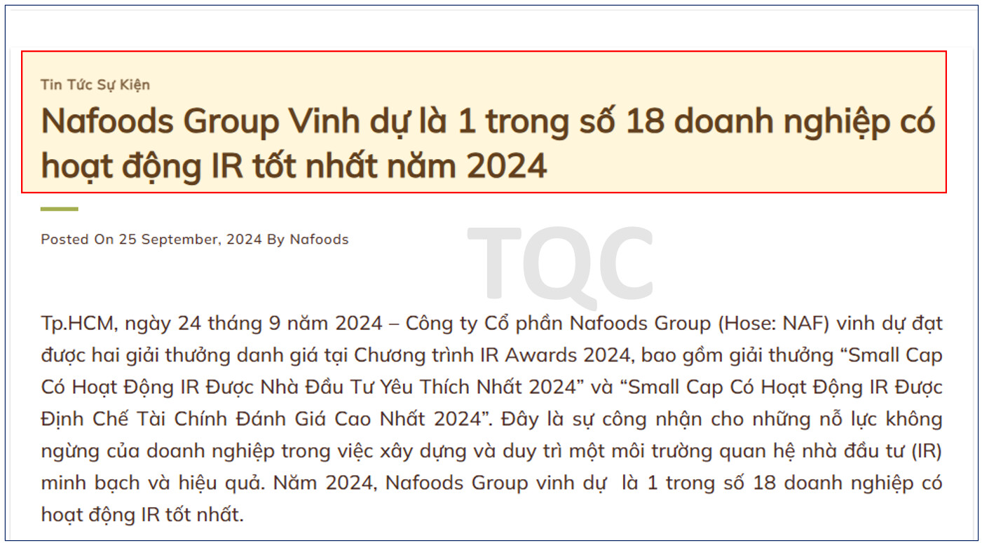Vượt qua hàng nghìn doanh nghiệp trên sàn, NAF đã trở thành 1 trong 18 công ty có hoạt động IR (Quan hệ cổ đông) tốt nhất 2024. Những doanh nghiệp có hoạt động IR tốt thì đều có tính minh bạch rất cao, đây là một điểm cộng lớn đối với NAF.