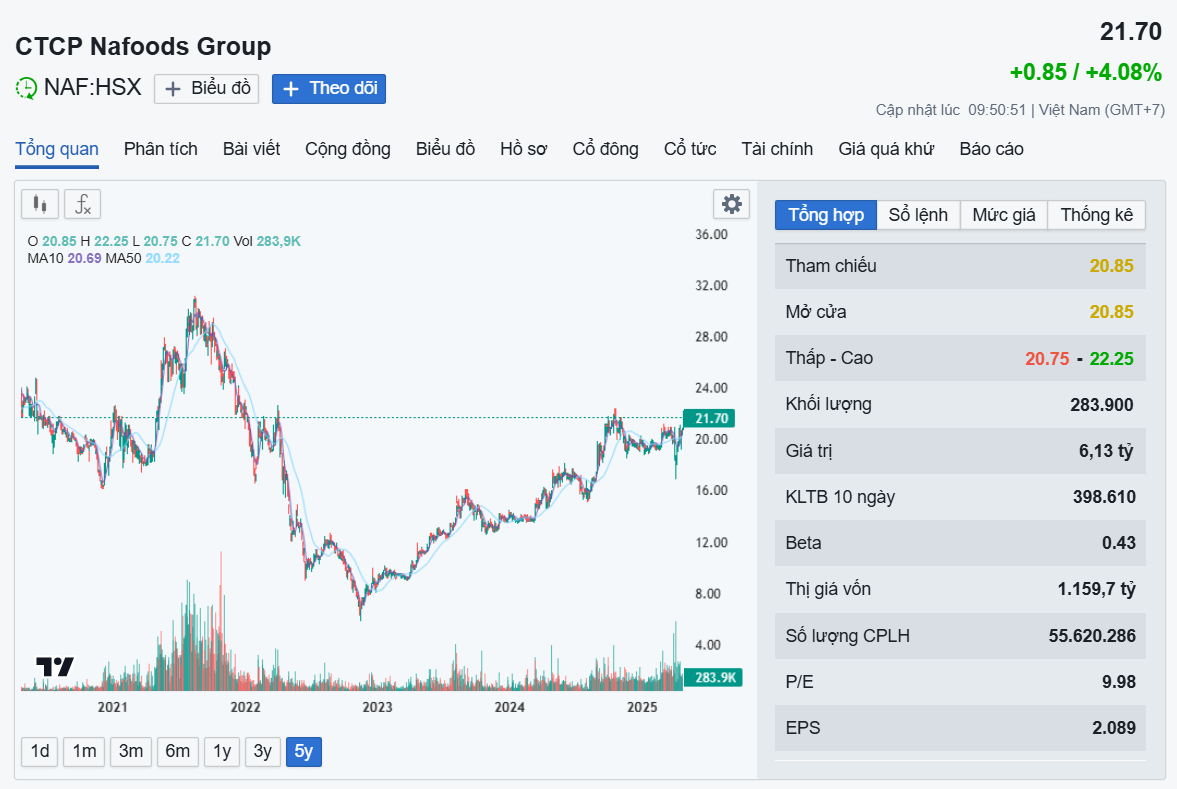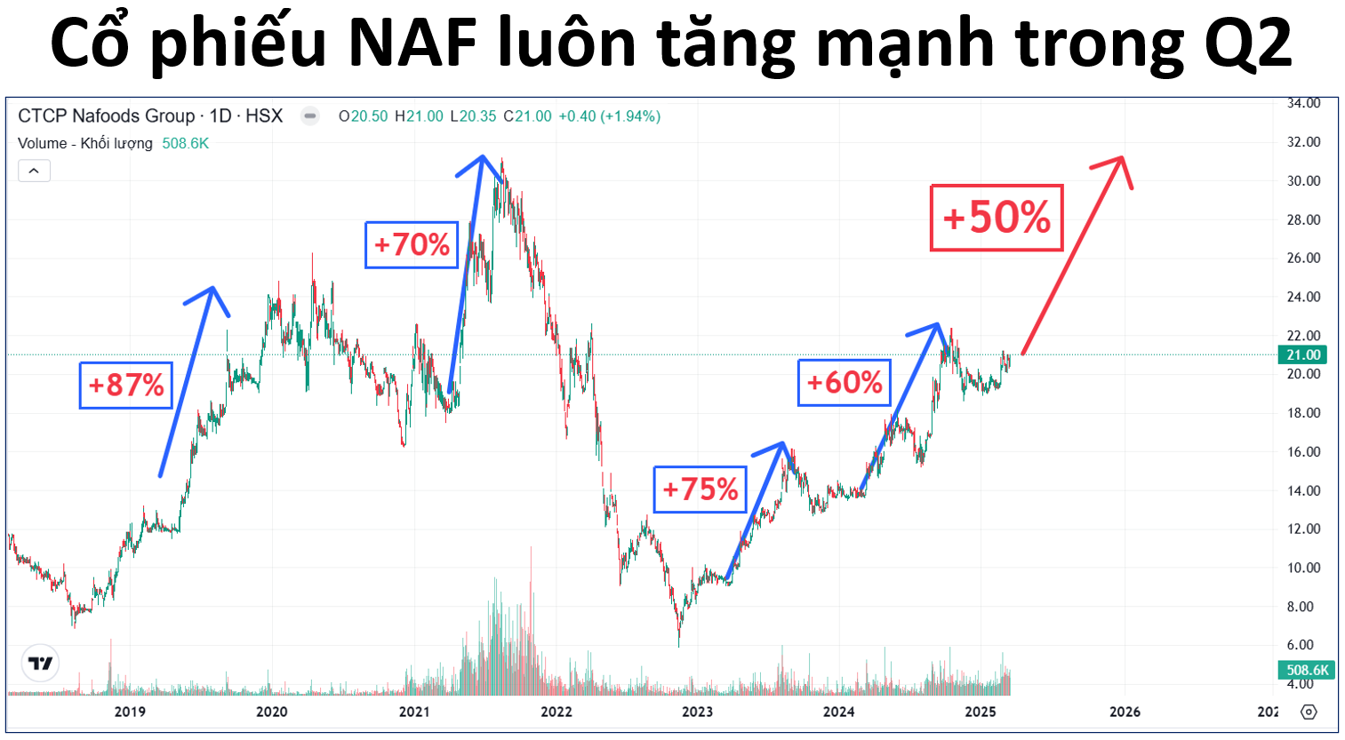 Trong giai đoạn từ 2019 - 2024, cứ bắt đầu bước vào quý 2 thì cổ phiếu NAF đều tăng mạnh. Với việc liên tục mở rộng quy mô sản xuất, vùng trồng & thị trường tiêu thụ, kỳ vọng lợi nhuận trong Q2/2025 của NAF sẽ lập kỷ lục mới. Do đó, nếu VNINDEX không gặp các sự kiện thiên nga đen thì việc giá cổ phiếu NAF quay về đỉnh cũ 2021 là điều hoàn toàn khả thi, tương ứng upside 50%.