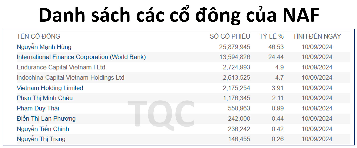 Người sáng lập NAF là ông Nguyễn Mạnh Hùng đang nắm giữ 46.53% cổ phần, do đó tỷ lệ lợi ích của ban lãnh đạo cũng sẽ gắn chặt với lợi ích của các cổ đông nhỏ lẻ trên sàn, cho nên chúng ta hoàn toàn có thể yên tâm về vấn đề đạo đức ban lãnh đạo khi nắm giữ NAF.