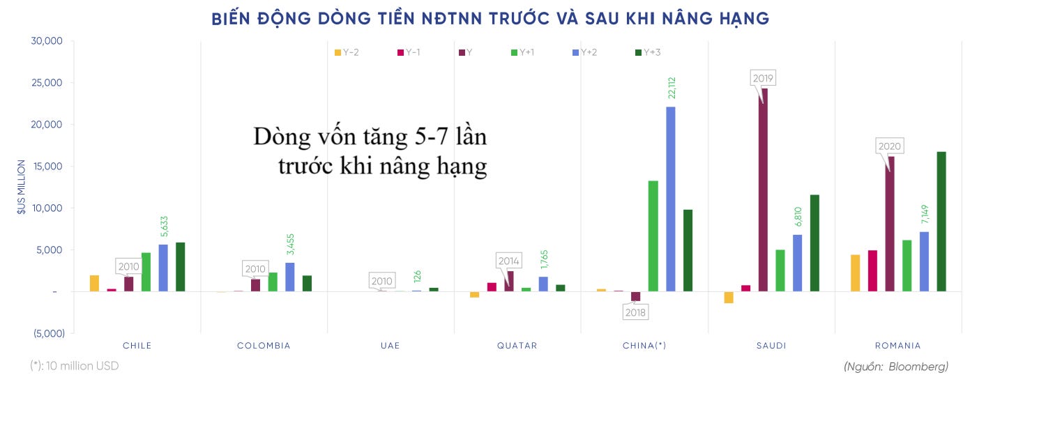 - Hầu hết các thị trường đều chứng kiến sự tăng trưởng mạnh mẽ về dòng vốn nước ngoài khi chính thức được nâng hạng, bất kể theo tiêu chí đánh giá của FTSE hay MSCI. Số liệu thống kê cho thấy dòng vốn thường tăng gấp 5-7 lần so với bình quân giai đoạn trước khi được nâng hạng .