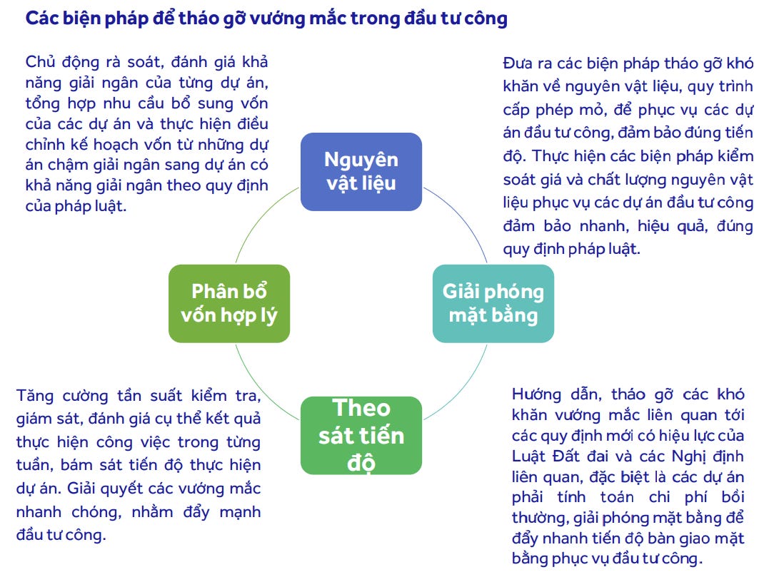 Để đẩy mạnh công tác giải ngân vốn cho các dự án hạ tầng trọng điểm, liên tiếp các biện pháp thúc đẩy giải ngân đầu tư công được Chính phủ ban hành .