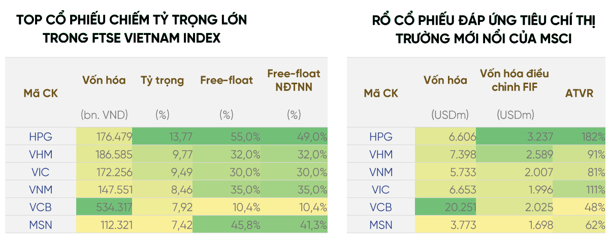 - Chúng tôi tập trung vào các doanh nghiệp đáp ứng các tiêu chí nâng hạng thị trường theo FTSE và MSCI và chiếm tỷ trọng cao trong rổ cổ phiếu được lựa chọn của 2 tổ chức này.