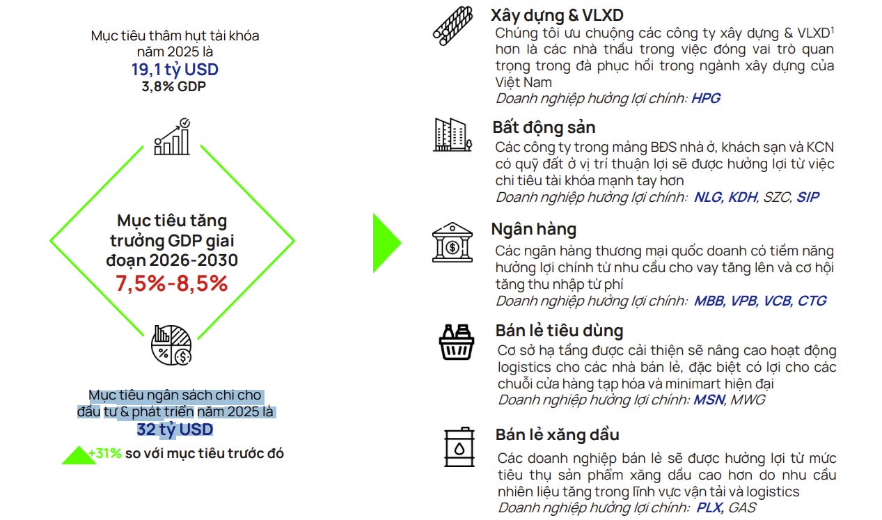 - Vì vậy, để đạt mục tiêu tăng trưởng 6.5% -7.0% trong giai đoạn 2021 -2025, các nhà điều hành sẽ đưa ra nhiều chính sách thúc đẩy tăng trưởng trong năm 2025. Trong đó, đầu tư công được kỳ vọng sẽ tăng tốc nhờ lạm phát hạ nhiệt và tỷ giá ổn định hơn vào giai đoạn cuối năm 2025.