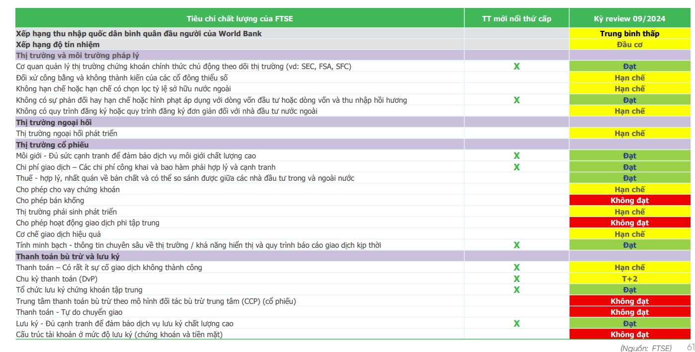 1. Cập Nhật Đánh Giá xếp hạng FTSE tháng 9/2024. Việt Nam đáp ứng hầu hết các tiêu chí nâng hạng lên thị trường mới nổi của FTSE.