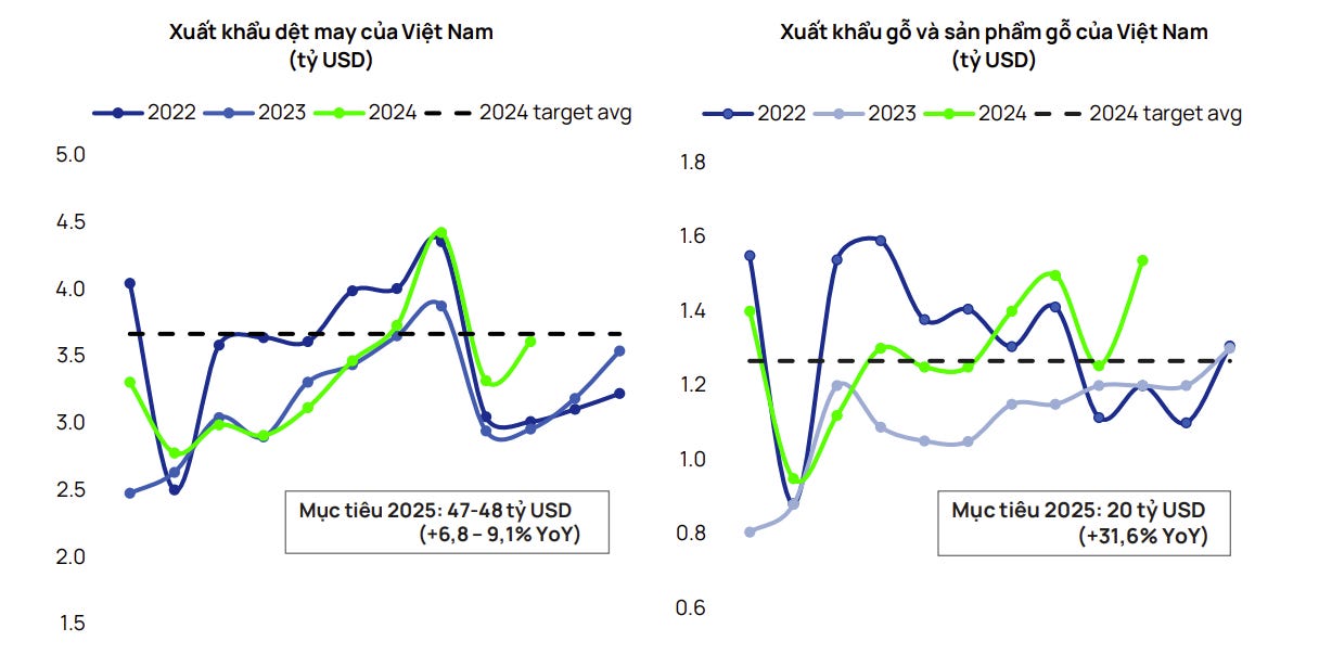 - Dệt may mục tiêu 2025: 47-48 tỷ USD (tăng 6.8% -9,1% so với năm 2024), Xuất Khẩu gỗ mục tiêu 2025: 20 tỷ USD (tăng 31.6% vo với 2024).