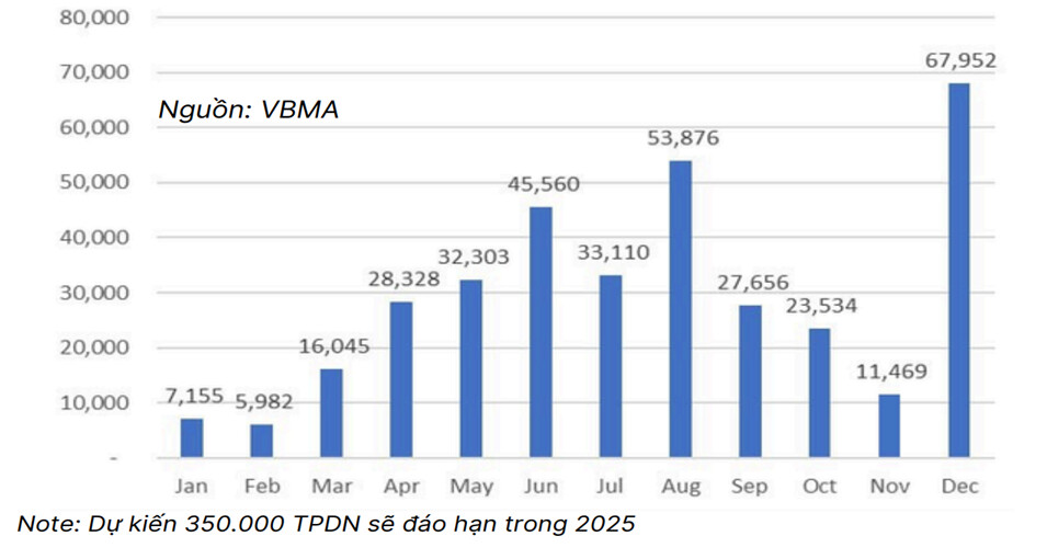 Câu chuyện đáo hạn TPDN 2025 dư nợ cả gốc lẫn lãi khoảng 334.000 tỷ đồng (2024 là 315.000 tỷ đồng), đặc biệt trong đó riêng trái phiếu bất động sản dư nợ đáo hạn dự kiến 135.000 tỷ đồng, gấp 2.25 lần so với 60.000 tỷ đồng 2024