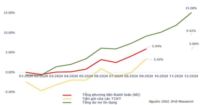 Cung tiền M2 trong năm 2024 chứng kiến sự co hẹp đáng kể của nền kinh tế (+9.42%YTD), chiếm phần lớn trong đó đến từ việc giảm dự trữ ngoại hối khoảng 9,35 tỷ USD trước áp lực tỷ giá