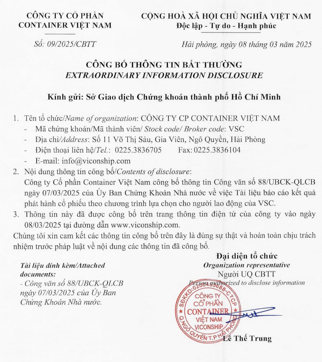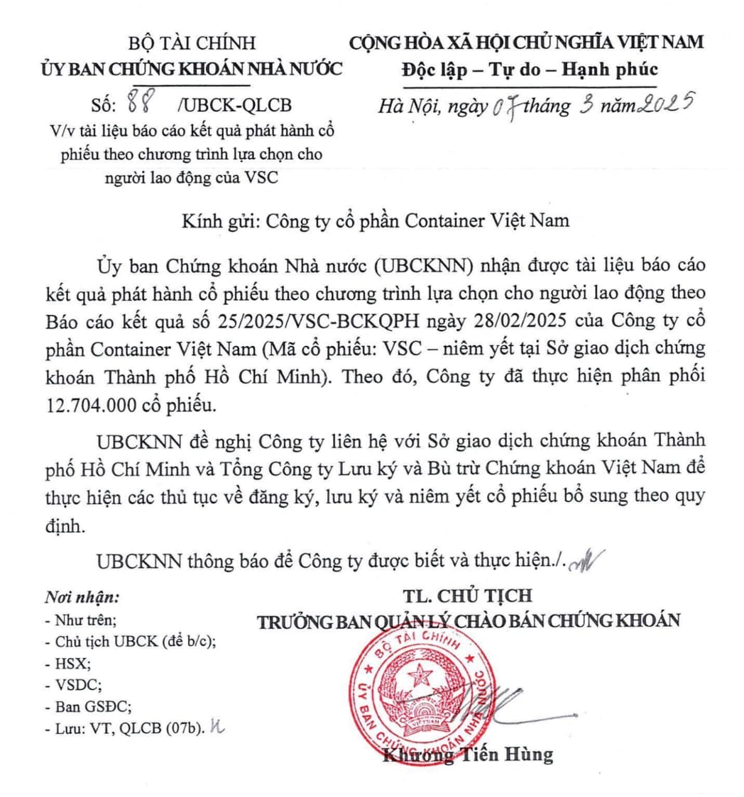 Công ty Cổ phần Container Việt Nam thông báo công văn của UBCKNN về tài liệu báo cáo phát hành cổ phiếu ESOP của VSC như sau: