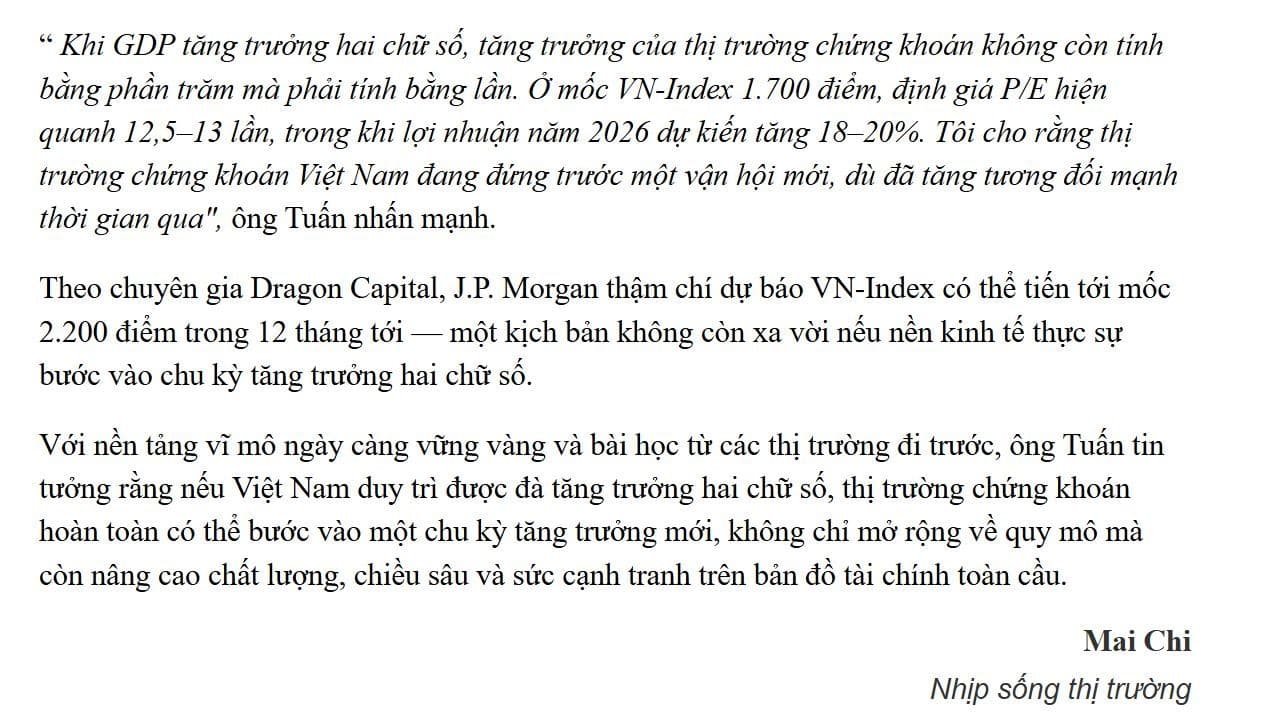 Tổng Giám đốc Dragon Capital: Tăng trưởng GDP 10% hoàn toàn khả thi, TTCK tăng không tính bằng phần trăm mà phải tính “bằng lần”