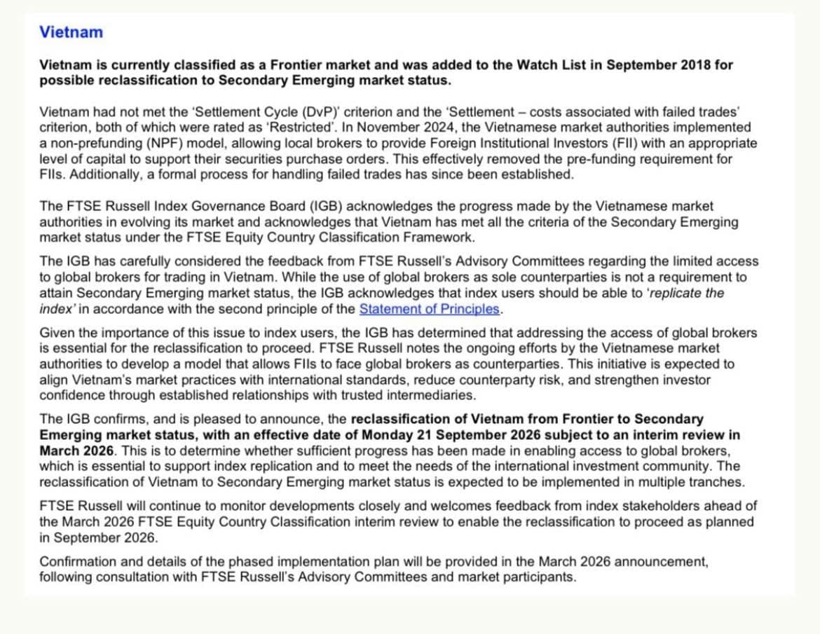 Theo thông báo mới nhất từ FTSE Russell, Việt Nam sẽ chính thức được nâng hạng từ thị trường cận biên (Frontier) lên thị trường mới nổi thứ cấp (Secondary Emerging) vào thứ Hai, ngày 21 tháng 9 năm 2026.