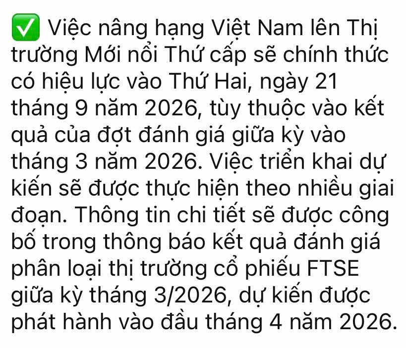 FTSE xác nhận sẽ nâng hạng thị trường chứng khoán Việt Nam lên nhóm Secondary Emerging Market (Thị trường mới nổi thứ cấp) vào tháng 9/2026, sau một kỳ đánh giá giữa kỳ tháng 3/2026.