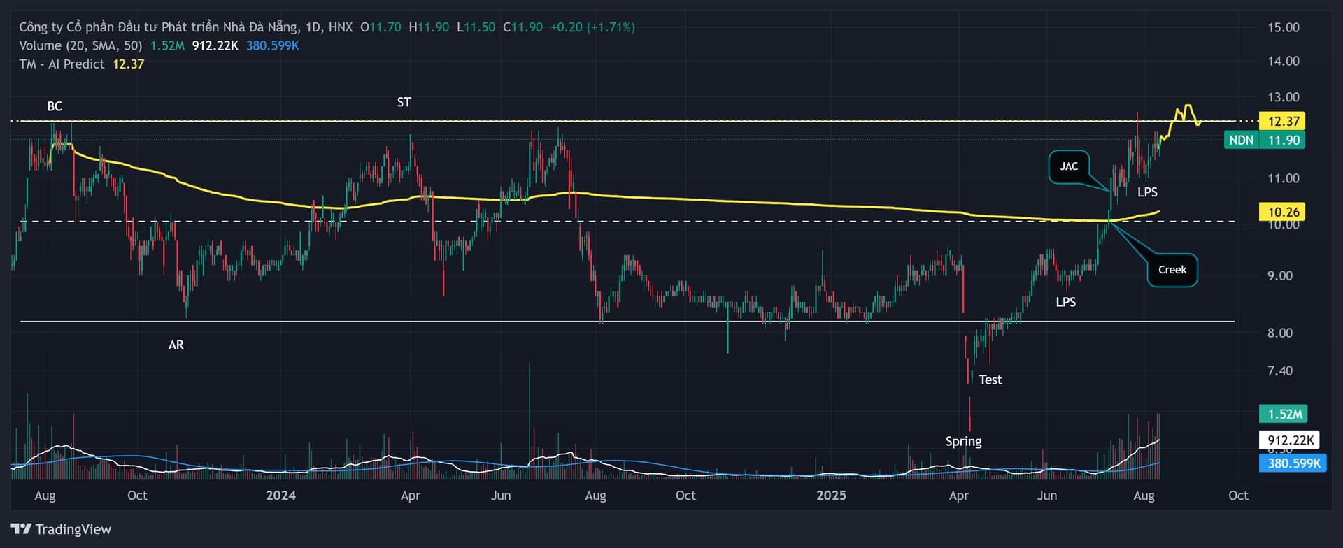 Từ góc độ kỹ thuật, NDN đang ở pha D của mô hình tái tích lũy Wyckoff – giai đoạn mà lực cung đã cạn và dòng tiền tích lũy sẵn sàng kích hoạt một nhịp tăng giá mới. Sự đồng thuận giữa yếu tố vĩ mô (thị trường vào sóng, thanh khoản cải thiện), yếu tố vi mô (tỷ trọng danh mục đầu tư lớn, lợi nhuận chưa thực hiện rõ ràng, tài sản thanh khoản cao) và yếu tố định giá (P/B thấp hơn đáng kể so với trung bình ngành) cho thấy NDN đang hội tụ đầy đủ điều kiện để trở thành một cơ hội đầu tư hấp dẫn trong giai đoạn hiện tại.