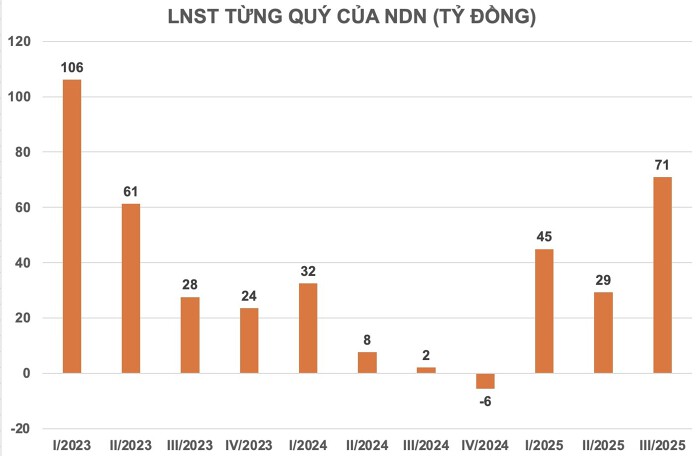 Chính điều này mở ra một hướng tiếp cận khác: thay vì chỉ tập trung vào nhóm cổ phiếu chứng khoán, nhà đầu tư có thể tìm kiếm những doanh nghiệp ngoài ngành nhưng có tỷ trọng danh mục đầu tư chứng khoán lớn trên tổng tài sản. Đây là nhóm doanh nghiệp sẽ được hưởng lợi trực tiếp từ sóng tăng của thị trường mà không phụ thuộc vào hoạt động môi giới hay cho vay margin. Trong nhóm này, NDN nổi bật nhờ sở hữu một danh mục cổ phiếu niêm yết quy mô lớn, thanh khoản cao, và có lợi nhuận chưa thực hiện rất lớn