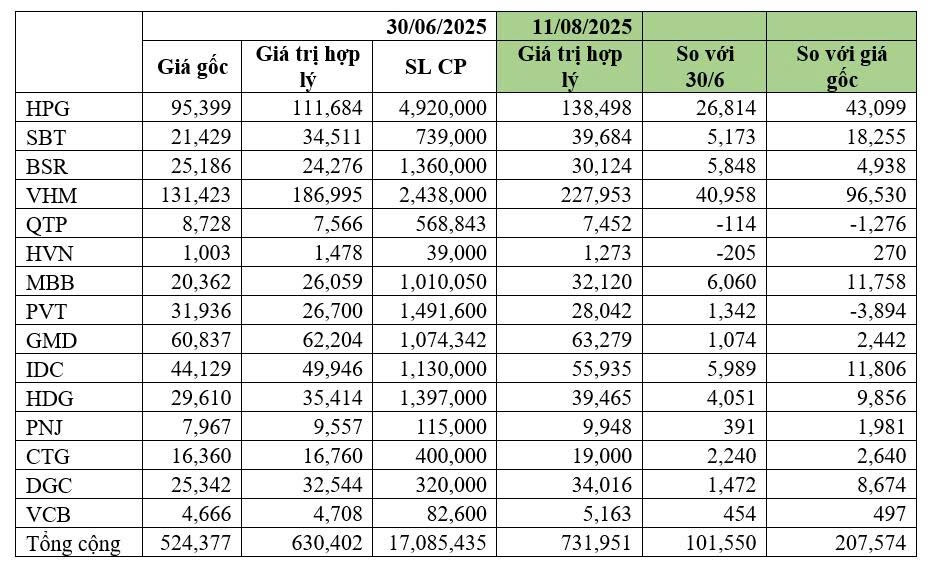 Điểm đáng chú ý là tỷ lệ giá trị danh mục đầu tư chứng khoán của NDN trên tổng tài sản ở mức rất cao so với mặt bằng chung các doanh nghiệp niêm yết ngoài ngành tài chính. Điều này đồng nghĩa với việc biến động tích cực của thị trường chứng khoán sẽ có tác động tức thì và đáng kể đến NAV của công ty. Danh mục tại ngày 11/8/2025 đạt 731,951 tỷ đồng, cao hơn giá gốc tới 207,574 tỷ đồng – đây là phần lợi nhuận chưa thực hiện hoàn toàn có thể hiện thực hóa ngay khi cần. Các khoản đầu tư tập trung vào cổ phiếu vốn hóa lớn, thanh khoản cao như VHM, HPG, MBB, IDC… giúp NDN linh hoạt trong chốt lời, giảm thiểu rủi ro