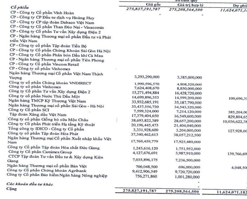 Trái lại công ty lại có dấu hiệu tích cực tham gia đầu tư chứng khoán khi tăng đầu tư thêm 367,1 tỷ đồng lên 513,1 tỷ đồng vào thị trường. Trong đó, khoản đầu tư lớn nhất là Ngân hàng TMCP Sài Gòn - Hà Nội (SHB) trị giá 225,6 tỷ đồng; Ngân hàng Thương mại cổ phần Kỹ thương Việt Nam (TCB) là 78,3 tỷ đồng; CTCP Vinhomes (VHM) là 39 tỷ đồng; Ngân hàng Thương mại cổ phần Xuất nhập khẩu Việt Nam (EIB) là 32,7 tỷ đồng…