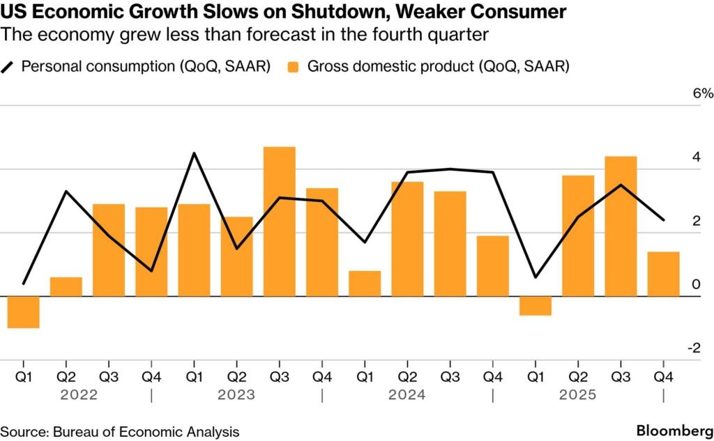 Bureau of Economic Analysis vừa công bố GDP thực tăng theo năm đạt 1,4% trong quý IV — thấp hơn kỳ vọng và giảm mạnh so với mức 4,4% của quý trước. Tuy nhiên, con số tiêu đề này gây hiểu nhầm. Đợt đóng cửa chính phủ liên bang kéo dài kỷ lục từ tháng 10 đến giữa tháng 11 đã lấy đi khoảng 1 điểm phần trăm tăng trưởng khi chi tiêu liên bang giảm 16,6%. Loại bỏ lực cản “tự gây ra” này, tăng trưởng nền tảng xấp xỉ 2,4% — phù hợp với quỹ đạo tăng trưởng lành mạnh. Chi tiêu tiêu dùng tăng 2,4%, đầu tư doanh nghiệp tăng 3,8% nhờ làn sóng đầu tư vốn liên quan AI, và việc chấm dứt đóng cửa chính phủ được kỳ vọng tạo lực đẩy đáng kể cho đầu năm 2026.