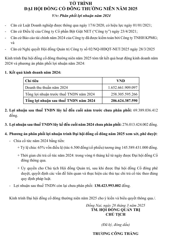 CTCP Bột giặt NET (HNX: NET) sẽ tổ chức Đại hội đồng cổ đông thường niên 2025 vào sáng ngày 18/4 tại tỉnh Đồng Nai. Nội dung đáng chú ý nhất trong kỳ họp là kế hoạch chi trả cổ tức cho năm tài chính 2024.