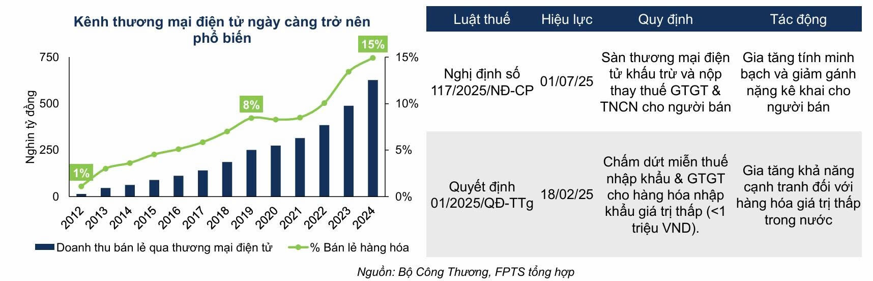 Ngoài ra, việc chuyển đổi từ thuế khoán sang thuế theo doanh thu có thể giảm tính cạnh tranh về giá của nhóm hàng xách tay – vốn trước đây thường trốn thuế nhập khẩu. Theo khung pháp lý mới, người bán các sản phẩm này buộc phải sử dụng dịch vụ logistics của bên thứ ba để thực hiện thủ tục nhập khẩu và nộp các loại thuế nhập khẩu liên quan, dẫn đến giá bán cuối cùng cao hơn. Các mặt hàng thường bị ảnh hưởng bao gồm thực phẩm chức năng, mỹ phẩm, thiết bị nhà bếp và một số dòng điện thoại như Xiaomi và Apple iPhone. Do đó, các nhà bán lẻ tuân thủ thuế được kỳ vọng hưởng lợi nhiều nhất trong bối cảnh quản lý chặt chẽ hơn.