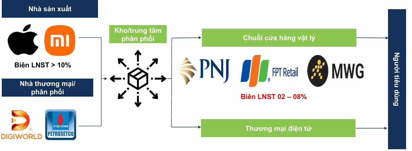 Mảng điện thoại/máy tính xách tay chúng ta có thể nhắc đến MWG, FPT Shop của FRT. Nhà bán buôn có DGW (Digiworld) thống trị. Lĩnh vực tiêu dùng nhanh thiết yếu có Winmart của Masan hay Bách hóa xanh của MWG. Dược phẩm có thể kể đến chuỗi Long châu của FRT. Hưởng lợi từ việc tự do hóa thị trường vàng thì không thể không nhắc đến PNJ.