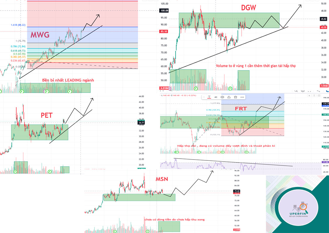 MWG – FRT – DGW – PET – MSN: đang ở pha tích lũy của tổ chức.