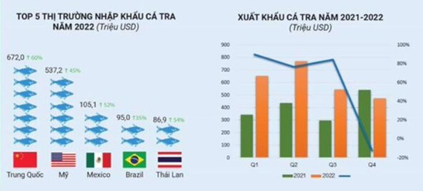 Top 5 thị trường xuất khẩu cá tra VN năm 2022: Trung Quốc đạt $672 (+60%), Mỹ đạt 537.2$ (+ 45%) ,Mexico đạt 105.1$ (+ 52%) , EU,…