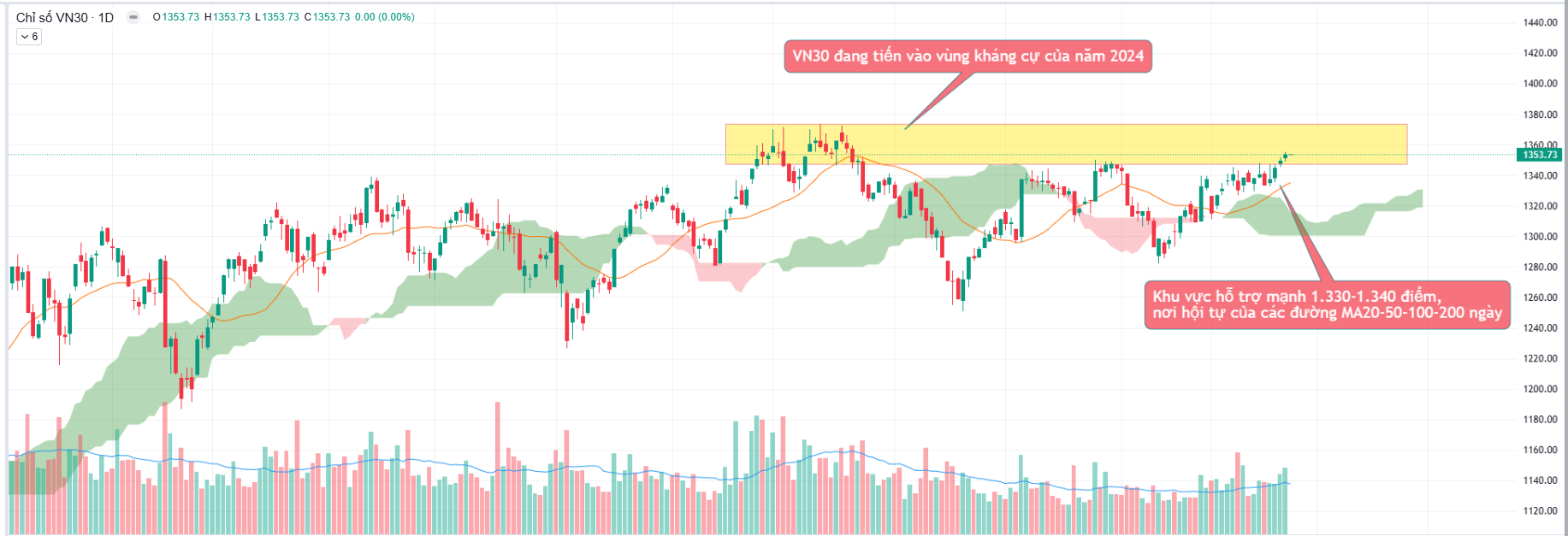 Với nhịp tăng dài nhất kể từ tháng 7/2023 và một lần nửa quay lại đỉnh cũ của năm 2024. Dự kiến VN-Index sẽ có nhịp rung lắc quanh khu vực 1.290-1.300 điểm trong phiên hôm nay và 1-2 phiên tới trước khi vượt qua vùng đỉnh khó nhằn của năm 2024 đầy biến động.