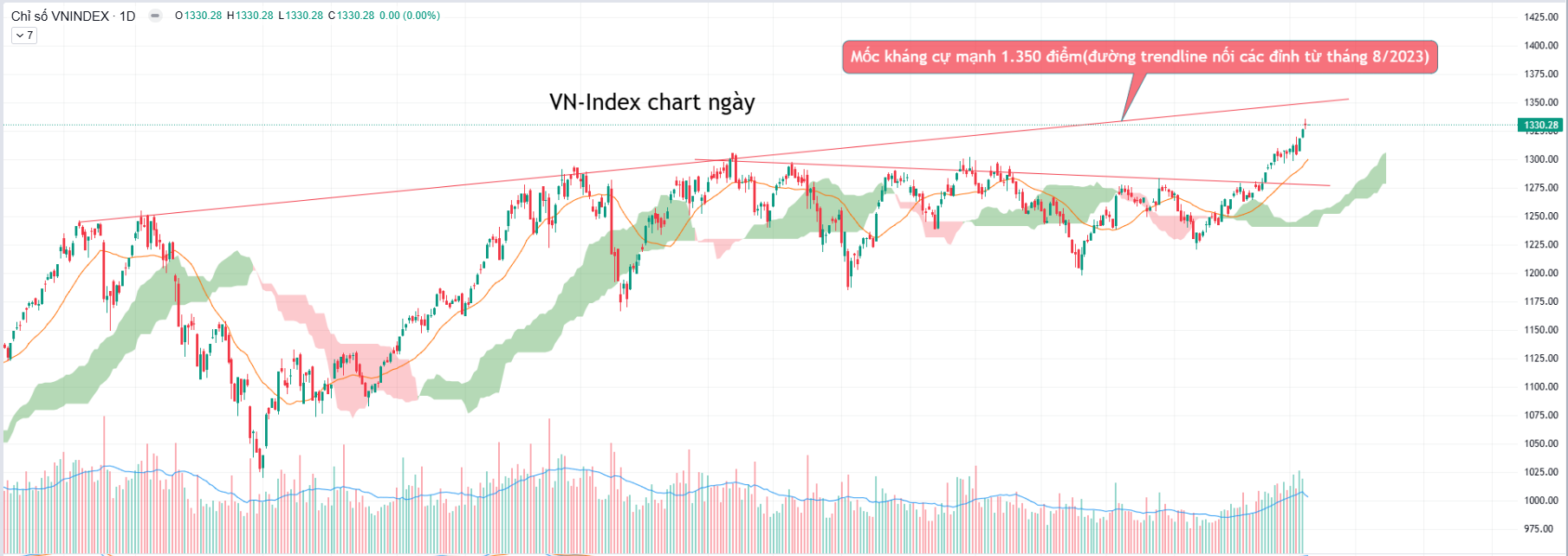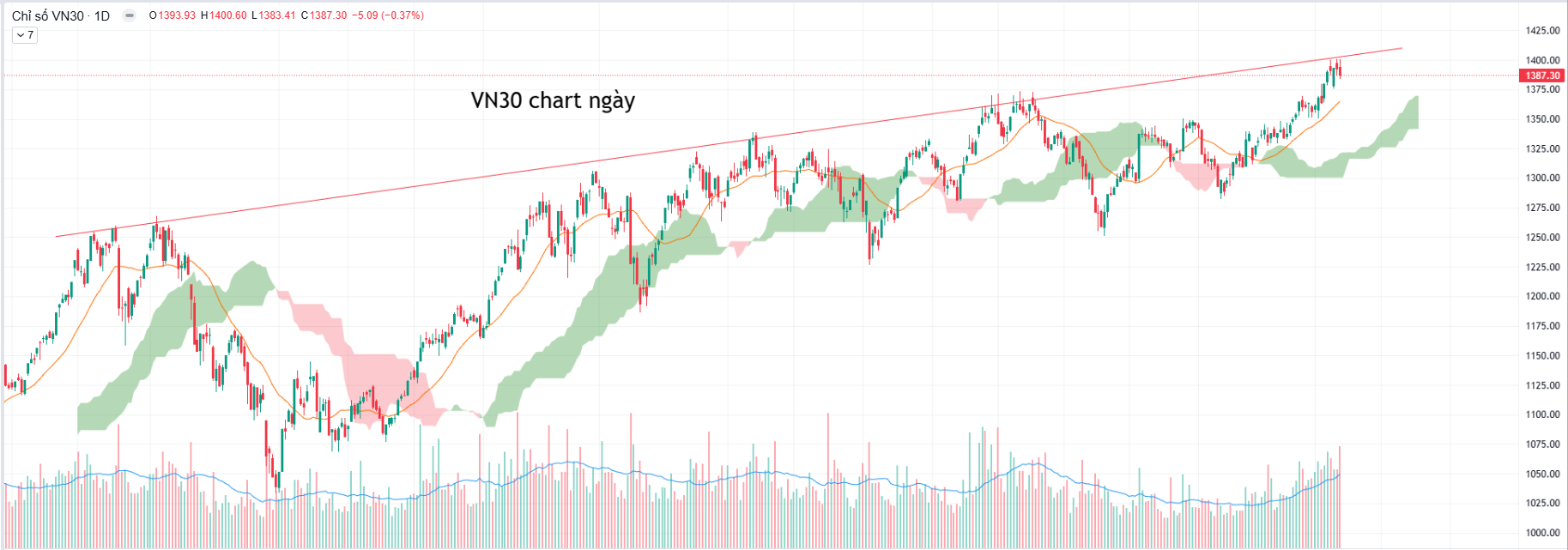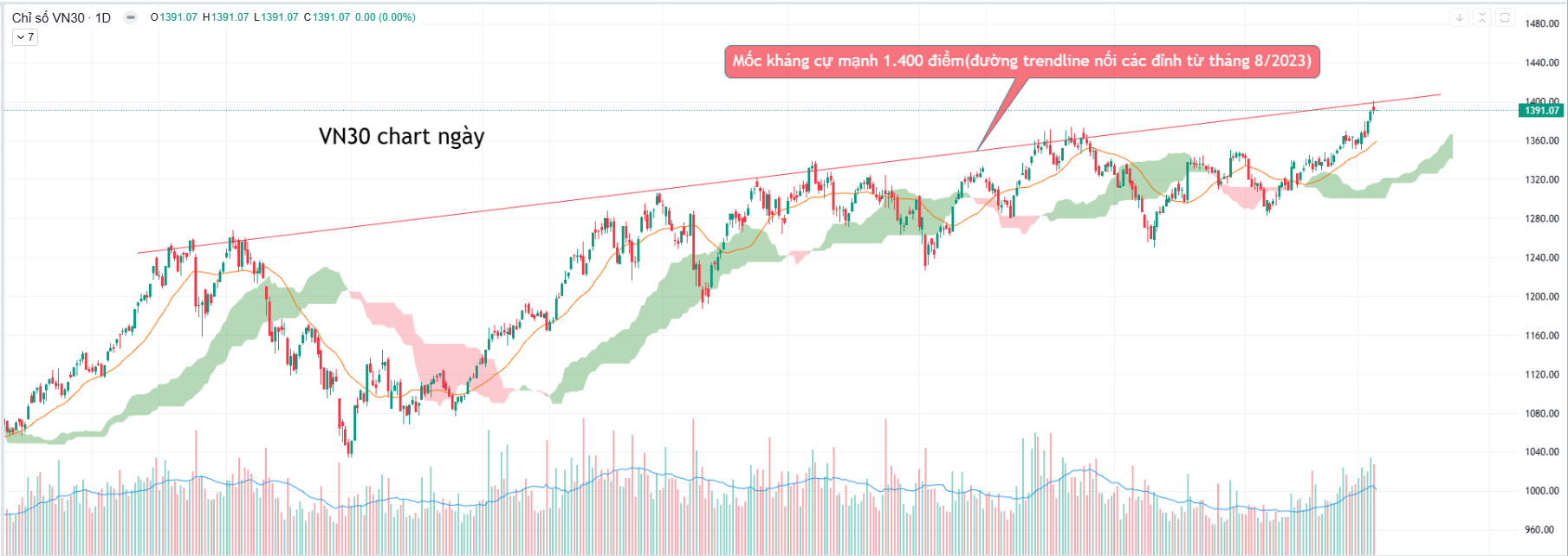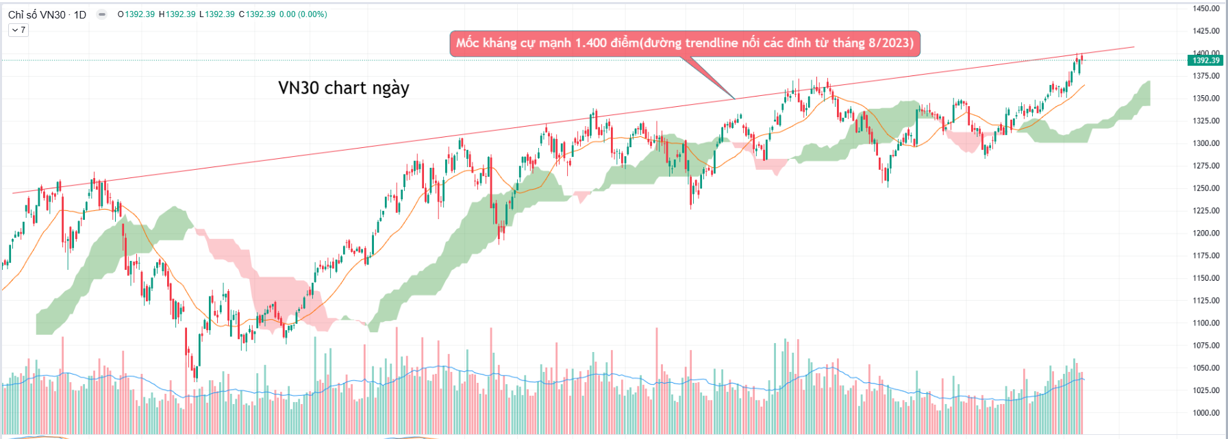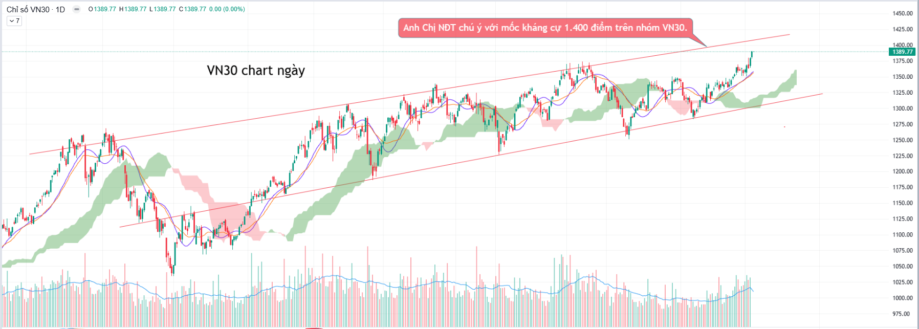 Cả nhà mình chú ý mốc kháng cự 1.400 điểm trên nhóm VN30, đây là mốc kháng cự mạnh khi nối các đỉnh kéo dài từ tháng 9/2023.