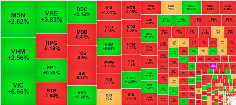 Trong số 142 mã tăng trên HoSE, chỉ có 15 mã đạt mức giao dịch trên 10 tỷ đồng nhưng nhóm VN30 góp đến 4 mã gồm VIC VHM VRE MSN