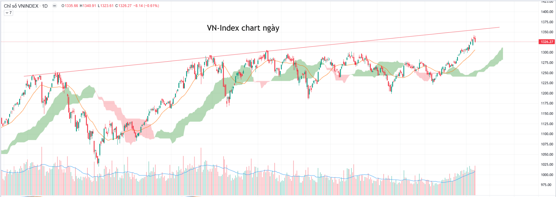 Về mặt kỹ thuật, ở khung đồ thị giờ, chỉ báo RSI quay đầu chỉnh nhẹ sau khi vào vùng quá mua và DMI có xu hướng thu hẹp tạo điểm giao cắt. Chỉ báo CMF = 0,04 cho thấy dòng tiền chủ động vẫn duy trì trên thị trường nhưng có phần hạ nhiệt dần ở vùng điểm số cao. Ở khung đồ thị ngày, VN-Index đóng cửa tạo cây nến lưỡng lự với thân đỏ trên đỉnh 1.330 điểm với khối lượng giao dịch lớn. Chỉ báo MACD và ADX vẫn hướng lên, cho thấy xung lực của đà tăng ngắn hạn vẫn còn mạnh.