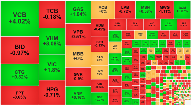 VCB VHM VIC là các trụ giao dịch nổi bật nhất, trong đó “siêu trụ” VCB đóng góp cho VN-Index đến 3,5 điểm.