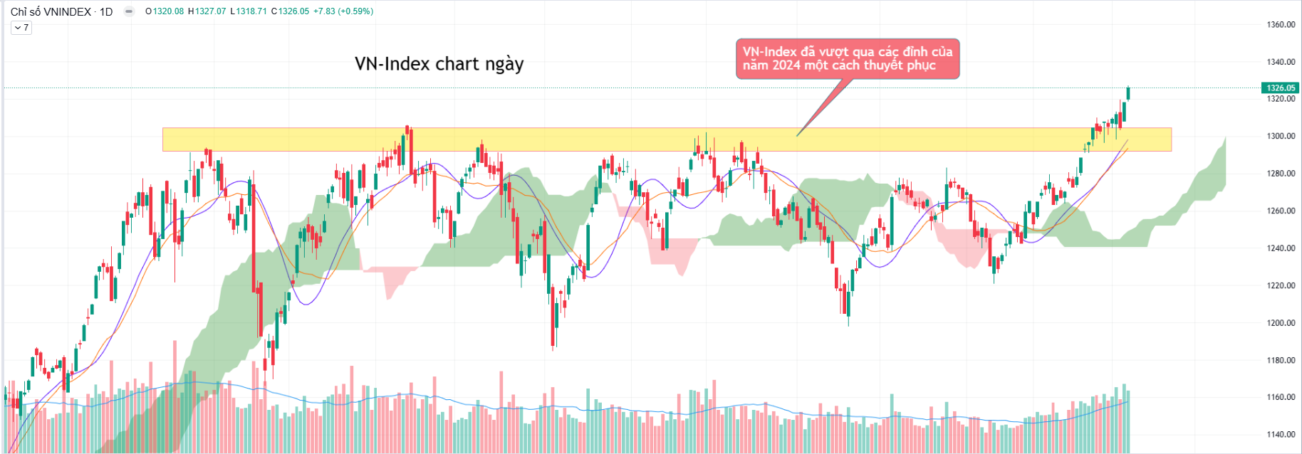 Về thị trường chung, mặc dù VN-Index đã vượt qua các đỉnh của năm 2024 một cách đầy thuyết phục nhưng với các đỉnh lớn VN-Index LUÔN có xu hướng quay lại kiểm tra trước khi tăng lên các mốc cao hơn. Do vậy mốc 1.300 điểm, VN-Index sẽ có nhịp kiểm tra lại trong thời gian tới. Anh Chị NĐT nào chưa mua được cổ phiếu trong thời gian qua, có thể cân nhắc ngồi chờ khi VN-Index quay lại mốc hỗ trợ này.