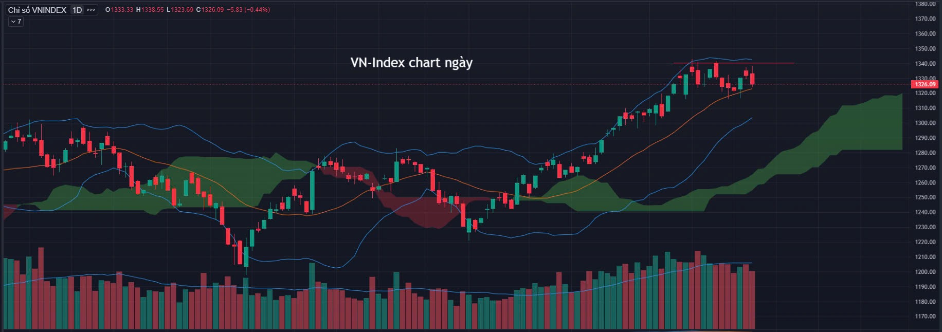 Tuy nhiên trên đồ thị ngày, thị trường chung đang kết thúc giai đoạn tăng giá mạnh kéo dài trong 8 tuần qua khi liên tục chịu áp lực điều chỉnh kiểm tra lại các vùng hỗ trợ. Ngoài ra thị trường sắp bước vào kỳ báo cáo KQKD quý 1/2025, đặt biệt là thông tin THUẾ QUAN ĐỐI ỨNG của chính quyền Trump sẽ công bố vào ngày 2/4 dẫn đến tâm lý thận trọng dâng cao. Xu hướng ngắn hạn đang chuyển qua giai đoạn điều chỉnh, tích lũy với vùng hỗ trợ gần nhất 1.315 điểm, hỗ trợ mạnh hơn 1.300-1.290 điểm.