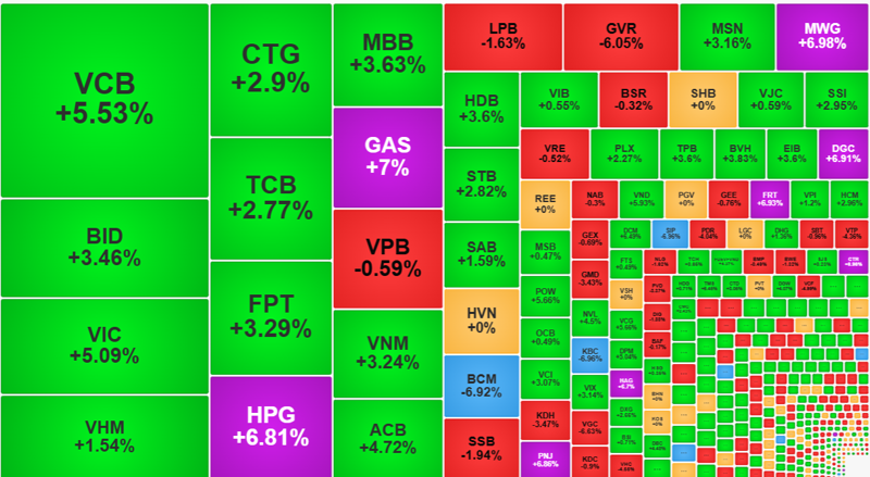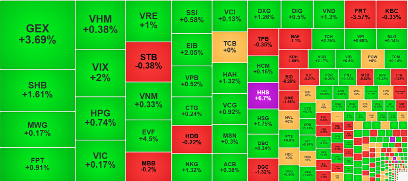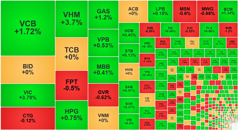 - VN-Index kết phiên tăng hơn 8 điểm, cổ phiếu xanh đang chiếm ưu thế trên cả VN-Index và VN30.