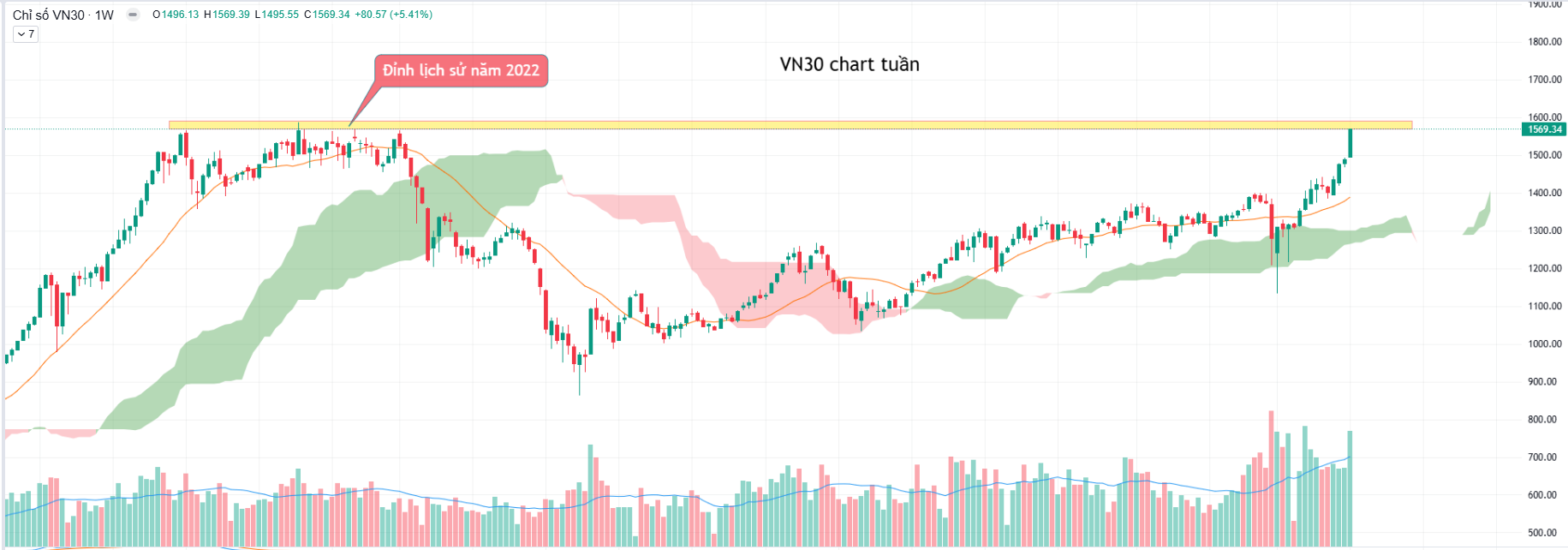 Chưa có dấu hiệu dừng lại, VN-Index có phiên bùng nổ với GAP UP tăng điểm phiên thứ tư liên tiếp, đồng thời đây cũng là nhịp tăng mạnh nhất kể từ năm 2021. Mẫu hình nến tăng giá áp đảo tiếp tục được hình thành tương tự những phiên trước đó, được hỗ trợ bởi mức thanh khoản đột biến và chuỗi mua ròng mạnh của nhà đầu tư nước ngoài.