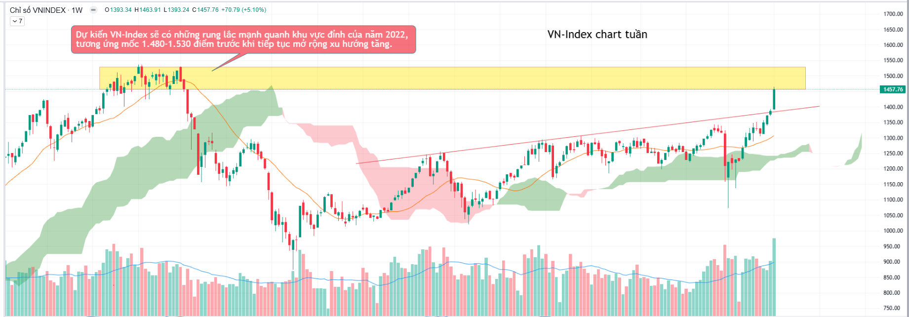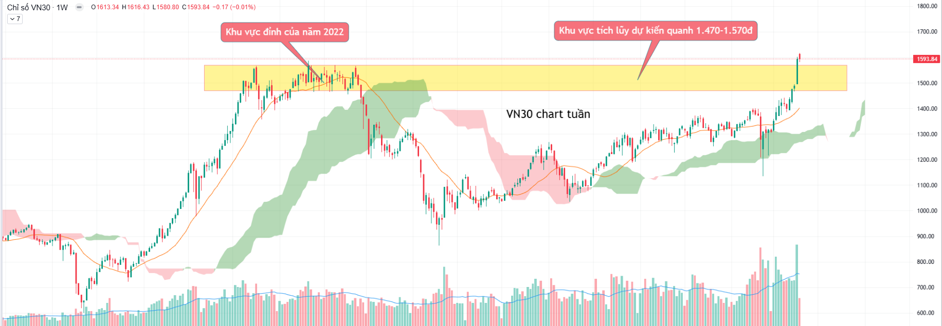 VN-Index sắp trải qua có 5 tuần tăng liên tiếp + thanh khoản lên cao nhất lịch sử + điểm số về lại đỉnh năm 2022 và khả năng là vượt lên mốc cao mới nên việc thị trường có những rung lắc trong các phiên sắp tới là bình thường khi các nhà đầu tư có xu hướng chốt lời mạnh hơn. Mặc dù vậy, để đảo chiều một xu hướng tăng trung hạn của VN-Index hiện tại đã được xác nhận sẽ cần nhiều phiên phân phối hay phải tạo từ 2-3 đỉnh và thời gian sẽ kéo dài.