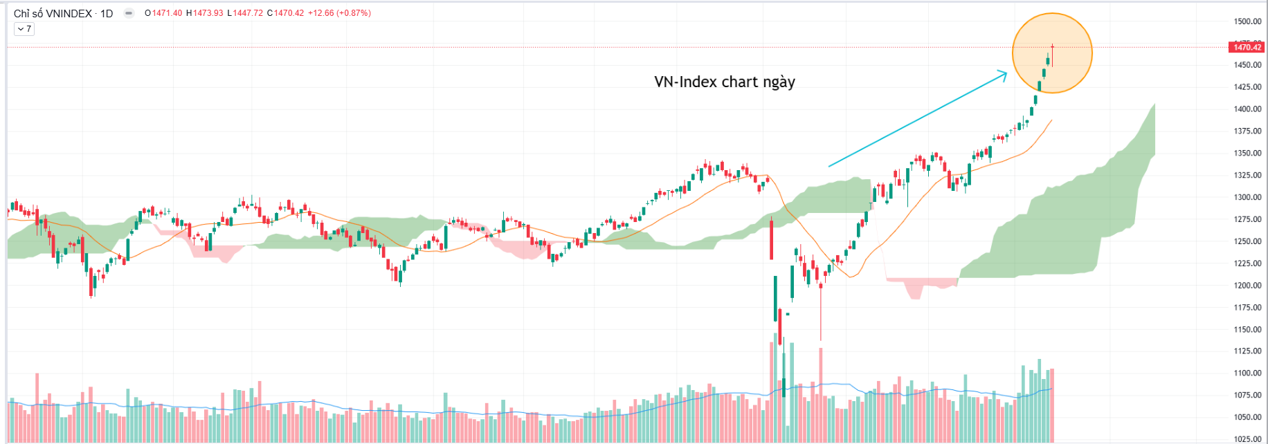 VN-Index đã trải qua có 4 tuần tăng liên tiếp + thanh khoản lên cao nhất lịch sử, việc thị trường có những rung lắc trong các phiên sắp tới là bình thường khi các nhà đầu tư có xu hướng chốt lời mạnh hơn. Mặc dù vậy, để đảo chiều một xu hướng tăng trung hạn của VN-Index hiện tại sẽ cần nhiều phiên phân phối hay phải tạo từ 2-3 đỉnh và thời gian sẽ kéo dài.