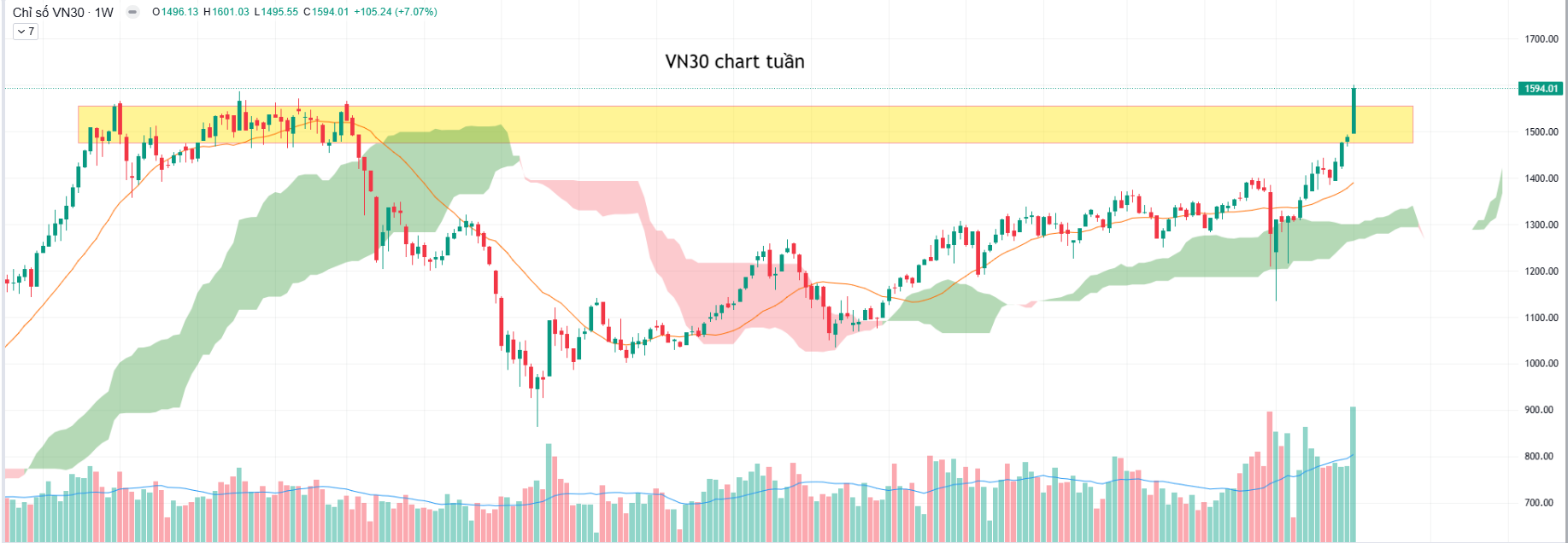 Chưa có dấu hiệu dừng lại, VN-Index tiếp tục có phiên cuối tuần trước bùng nổ với GAP tăng điểm phiên thứ 5 liên tiếp, được hỗ trợ bởi mức thanh khoản đột biến-mức thanh khoản cao nhất trong lịch sử VN-Index và chuỗi mua ròng rất mạnh của nhà đầu tư nước ngoài-chuỗi mua ròng mạnh nhất kể từ tháng 11/2022.