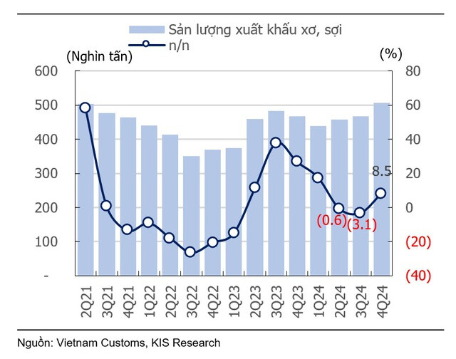 Trong quý IV năm 2024, xuất khẩu sợi đạt 1.15 tỷ đô (tăng +4.3%). Cụ thể, xuất khẩu sang Trung Quốc (nhà nhập khẩu sợi lớn nhất của Việt Nam) đang thu hẹp đà giảm so với những quý trước, với kim ngạch xuất khẩu đạt 0.57 tỷ USD. Đặc biệt, giá sợi giao dịch khá ảm đạm do vấn đề dư cung tiếp diễn, nhưng sản lượng xuất khẩu bắt đầu tăng trưởng dương, ghi nhận tăng +8.5%, báo hiệu sự phục hồi từ phía ngành công nghiệp gia công quần áo và giày dép (sợi là nguyên liệu đầu vào cho ngành gia công hàng may mặc và giày dép).