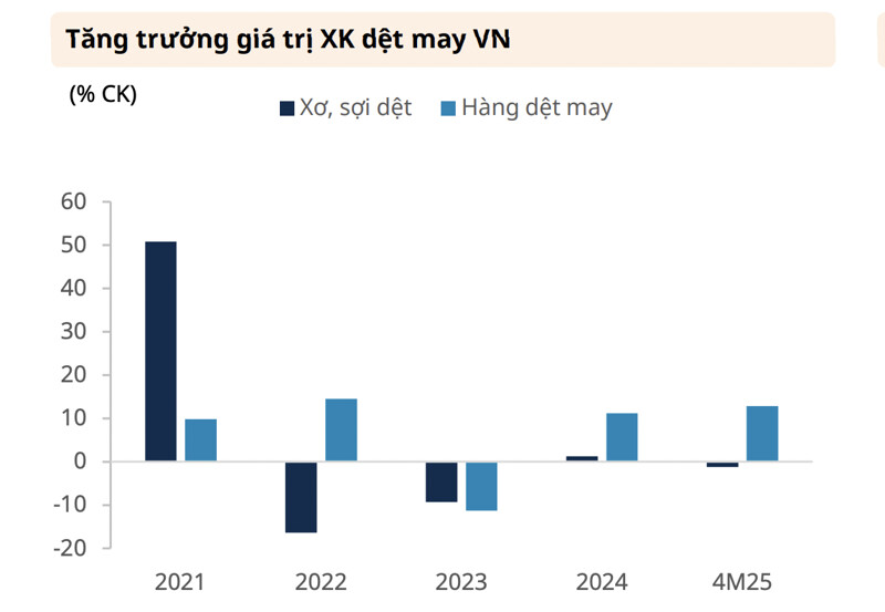 Tổng quan ngành dệt may trong những tháng đầu năm cho thấy, hai mảng chính của dệt may Việt Nam có diễn biến trái chiều. Sản phẩm dệt may có tốc độ tăng trưởng đáng kể về giá trị xuất khẩu, ở mức 12,8% so với cùng kỳ. Đáng chú ý, vào tháng 4 khi Chính phủ Hoa Kỳ công bố mức thuế mới đối với các đối tác thương mại, sản phẩm dệt may đã có tốc độ tăng trưởng cao hơn mức trung bình từ đầu năm, ở mức 17,7%.