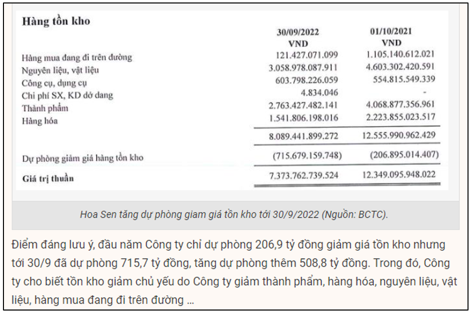 Trích lập hàng tồn kho: trong giai đoạn quý 3/2022, HSG đã phải trích lập tới 715 tỷ đồng khi dự trự hàng tồn kho lớn và bị lỗ sâu.
